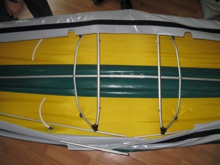 Сидушки снабжены отверстиями, позволяющими, при необходимости, притянуть сидушку к стрингерам и шпангоутам. Спинки байдарки крепятся на шпангоуты при помощи прочной и надёжной липучки, выполнены из пены EVA 15mm (25х8см).